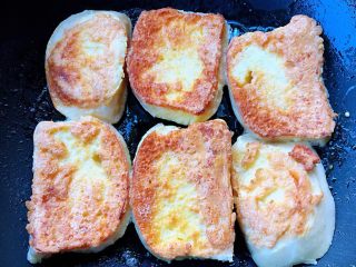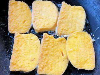 锅中倒入油加热再依次放入吸饱蛋液的馒头片中火开始煎制