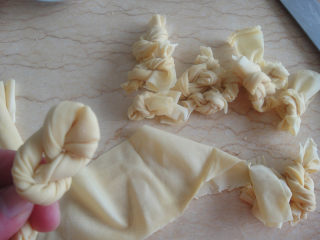 薄百叶先切成宽条再打结,