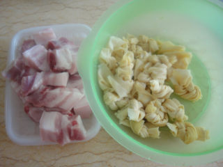 把百叶结用温水洗净后挤干水分,切块后用温水洗净