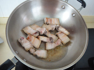 热锅加入底油,放入五花肉,把肉两面煎至变色后倒出多余的油