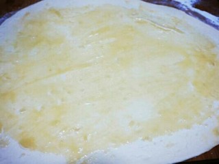 将面团揉一下并擀成5,6毫米的薄面片。均匀抹上制作好的油酥。