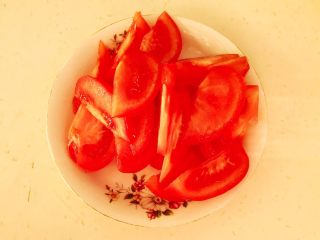 番茄顶部切成十字,然后用开水烫一下,剥皮后切成小块
