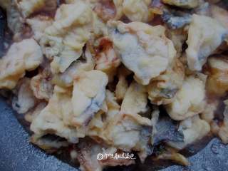 腌好的茄子将杀出的黑水倒去,放入面糊中调拌均匀,使每根茄子都沾满面糊。