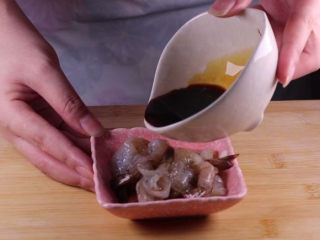 将处理好的虾装入小碟子中,倒入一小瓶盖的料酒、一小勺的生抽,用筷子拌匀后腌制备用。