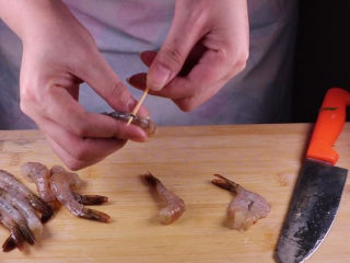 虾去壳洗净后,用牙签从虾背(第三个关节处)挑出虾线。接着用刀子给虾开背。