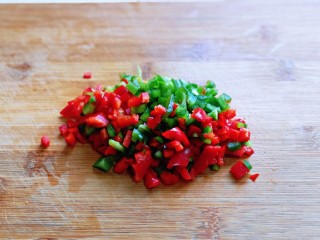 红绿椒洗干净去根,切小丁。