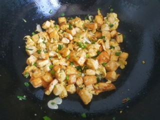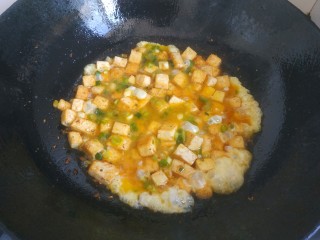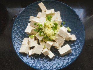 把豆腐放入盘中。加入葱花姜末
