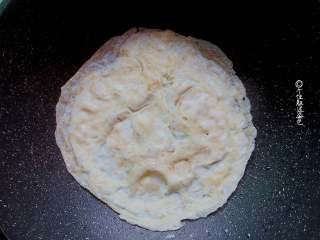 倒入蛋液,晃平表面,知道蛋皮鼓起泡泡,就熟了。