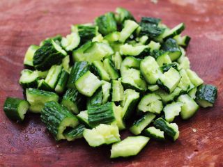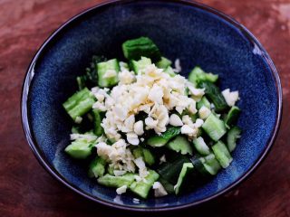 把切块的黄瓜,放入一个大碗里,放入绞碎的大蒜末。