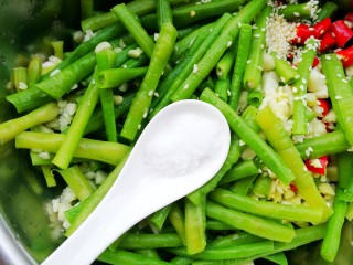 豆角放入大盆中,加入生姜大蒜小米椒,