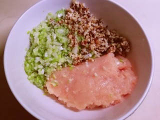 和泡好的蘑菇都切碎 鸡肉剁成肉泥 一同放入大碗里。