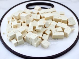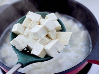 锅中倒入适量的清水煮沸,把豆腐进行焯水,插至豆腐变软紧实的时候,捞出沥干水分。