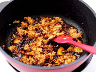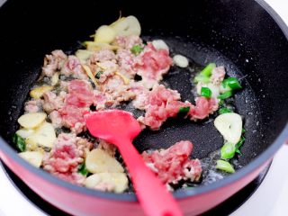 大火继续翻炒肉末至变色入味。