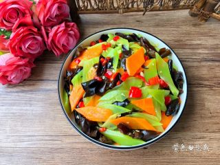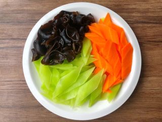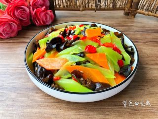 今天给大家分享的这道凉拌菜,所用的食材在日常生活中都非常常见的,但它们的营养价值都是相当高的。首先我们来说说莴笋,它有清热解毒,促进消化的功效,常吃还能预防缺铁性贫血。木耳中的铁元素含量丰富,能有效改善缺铁性贫血症状,具有很好的补血功效;它所含的膳食纤维能吸收肠道水分,促进身体废物排出,减少毒素对身体的伤害。胡萝卜有补肝明目,清热解毒的作用,把这三样食材一起凉拌,不仅清热解毒,还能排毒养颜,最重要的是特别开胃,超适合夏天食用。