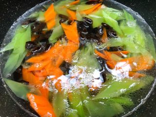 锅里放入适量水烧开,倒入一勺油,一勺盐,少许白糖拌匀,先把木耳放入焯3分钟,再加入胡萝卜和莴笋焯1分钟,焯好捞出来用凉开水过凉。
