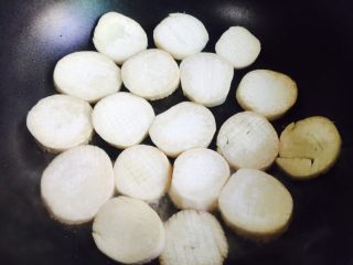 锅中倒入加热至七成热倒入杏鲍菇小火慢煎片刻至微微金黄