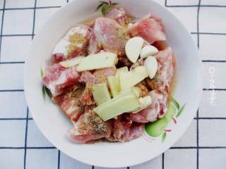 放入胡椒粉,生抽,老抽,糖,鸡精,食用油,葱姜,鸡精等调味料。用手将按摩片刻,让排骨充分吸收调味,腌制半个小时,这样比较入味。