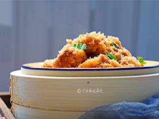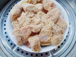 锅内放水烧开,放一个蒸架,把裹好蒸肉粉的排骨放盆子里,放在蒸架上转小火蒸一个小时。时间差不多时。