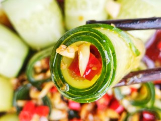 - 削黄瓜的时候要一步到位不要停顿,黄瓜比较脆容易断。喜欢吃脆黄瓜的浇油时候可以直接洒在底部,避免上部烫软。