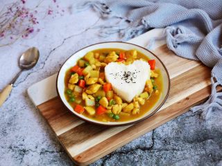 我们家小甜甜最爱吃我做的咖喱土豆鸡丁饭,今天小甜甜吃了一大份,好乖哦!咖喱土豆鸡丁饭做起来很简单,首先选用新鲜的鸡小胸,将鸡丁、土豆丁、胡萝卜丁豌豆都炒熟,然后放入咖喱块,咖喱块融化后,大火收汁,再配大米饭,好吃又下饭。