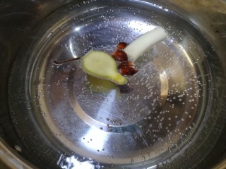 排骨焯水,凉水下锅,放入一段。