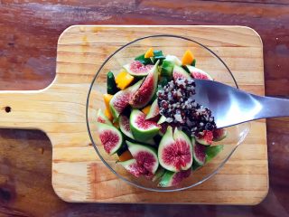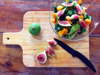 洗净,如图所示切块,放入沙拉碗! 由于无花果在生长过程中并不使用农药,所以是可以连皮一起吃的,而且果皮含有丰富的花青素,芽芽是绝对不舍得剥皮的!