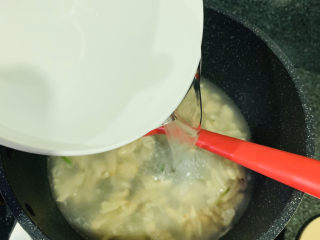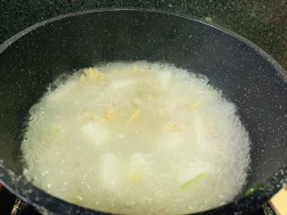 加入蛤蜊干炒香,先炒蛤蜊干,汤汁才会浓白;