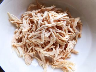 冷却之后的鸡胸肉撕成丝,粗细随你个人喜好,我因为今天时间有限,所以撕的有点粗犷