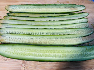 黄瓜清洗干净切掉头尾,用削皮刀刮成薄片