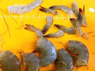 剪掉头尾,尾巴留用,虾头可以熬汤,扒壳