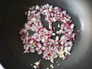 锅中适量烧热后下洋葱和蒜末炒香。