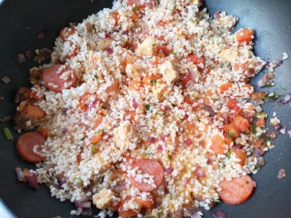 将所有海鲜均匀的铺在饭上,并往下轻轻按压至半埋在饭中。
