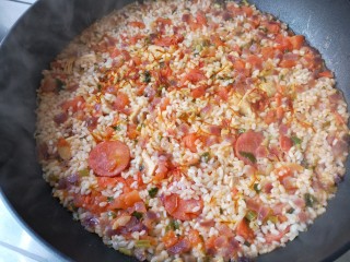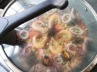 加盖转小火煮15-20分钟,不要翻动,让海鲜味融入饭里。