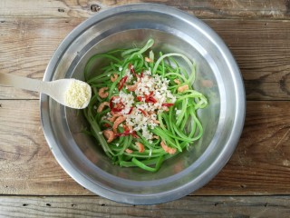 将炸好的油浇在干辣椒和蒜末上,伴随着次啦次啦的声响,香味就全被激发出来了。