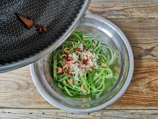 沥水捞出后迅速过一下凉开水备用。