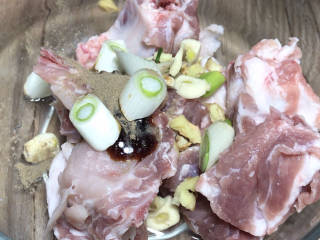 排骨洗净沥干水分,加入、、味极鲜酱油、、大葱姜蒜,抓捏均匀至排骨完全吸收料汁,腌制1小时左右