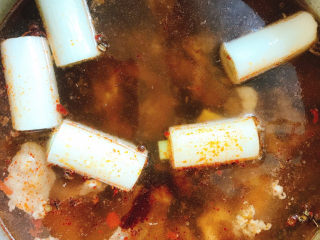 放入段,盖上锅盖大火烧开转中小火压30分钟。