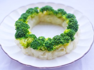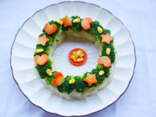 西兰花上摆上处理好的胡萝卜和玉米粒装饰。 圣诞花环,代表了一种保护和庇佑,可以让宝宝们在新的一年中不受妖魔伤害。
