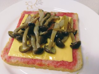 把煎好的蟹味菇放在芝士片上。