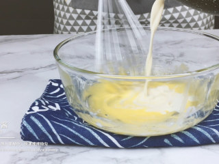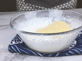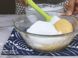 将全部蛋黄糊倒入蛋清中