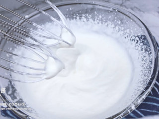 蛋清分三次加入细砂糖,首先低速打散,然后高速打发