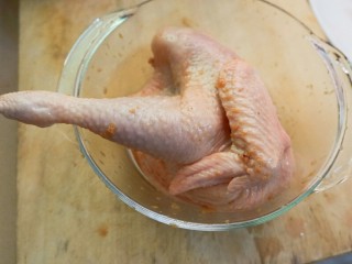 然后就可以另外半只按摩按摩按摩了!然后把它扔冰箱里腌四个小时以上!如果腌不够也没关系,我有办法补救,下面接着说。