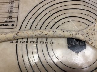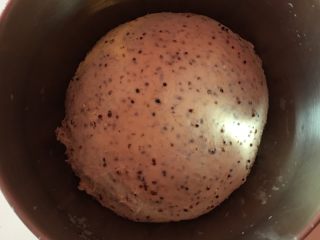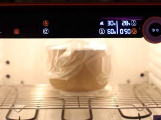 将与主面团除盐外的材料混合揉搓成无干粉状态后加入盐揉至扩展阶段,滚圆入盆,上覆保鲜膜。