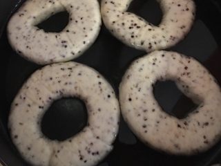 锅中放1000克水,倒入50克及煮沸后关小火,放入贝果双面各煮一分钟。