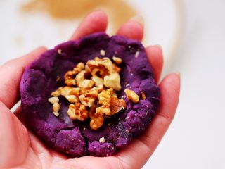 把紫薯面团分成6个大小一样的剂子,取一个剂子用手摁扁后,放入适量的果仁。