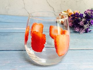 草莓切薄片用来装饰杯子,尽量切的薄一些容易贴在杯壁上
