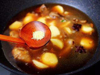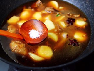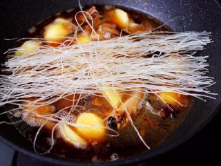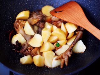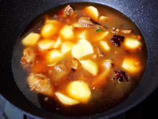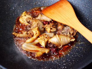 倒入卤肉汤,继续翻炒一会儿。
