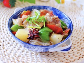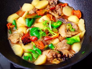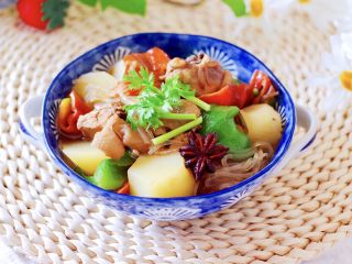 这是一道北方人都爱吃的家常炖菜,因其做法简单又美味,所以深受家人和我的喜爱,土鸡肉有温中益气、补虚填精、健脾胃、活血脉、强筋骨的功效,土豆含有大量膳食纤维,能宽肠通便,帮助机体及时排泄代谢毒素,防止便秘,预防肠道疾病的发生,土豆还具有减肥、保持血管弹性、排钠保钾等作用,对高血压患者有利,搭配上我们当地的地瓜粉条,简直不要太完美哟……