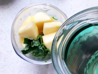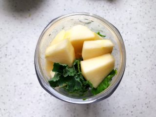 羽衣甘蓝撕下叶片,梗不要,用饮用水洗净,甩干水分