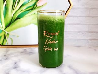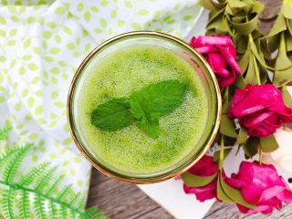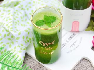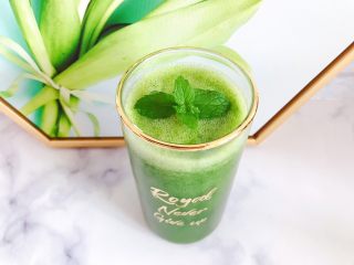 摆放上一片清洗干净的薄荷叶点缀装饰,我们的这一杯羽衣甘蓝芝麻菜苹果汁就完成了,很简单,一学就会了是吧~